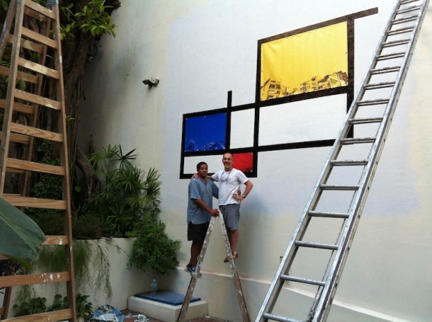 3×2 meters (9×6 feet), mixed technique of photography on vinyl plus painting, site specific installation on backyard’s wall below the same sky/buildings photographed in the images.