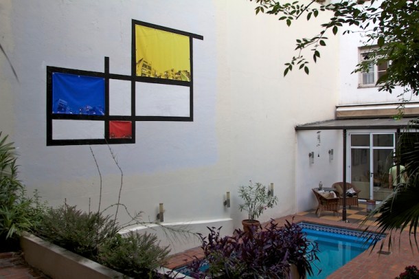 3×2 metros, técnica mixta de fotografías sobre vinilo mas pintura, instalación site specific en el muro de un jardín bajo el mismo cielo/edificios fotografiado en las imágenes.