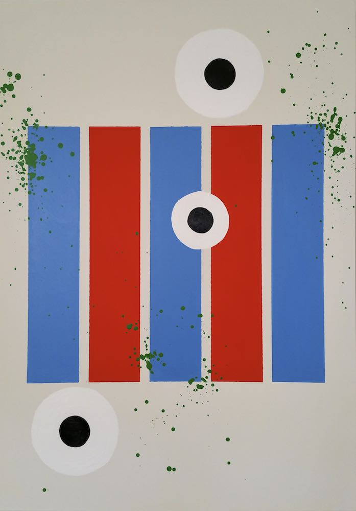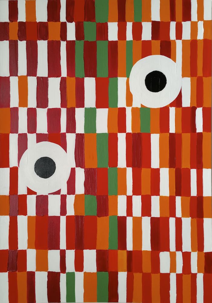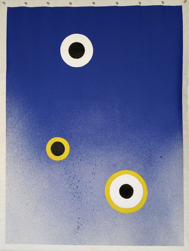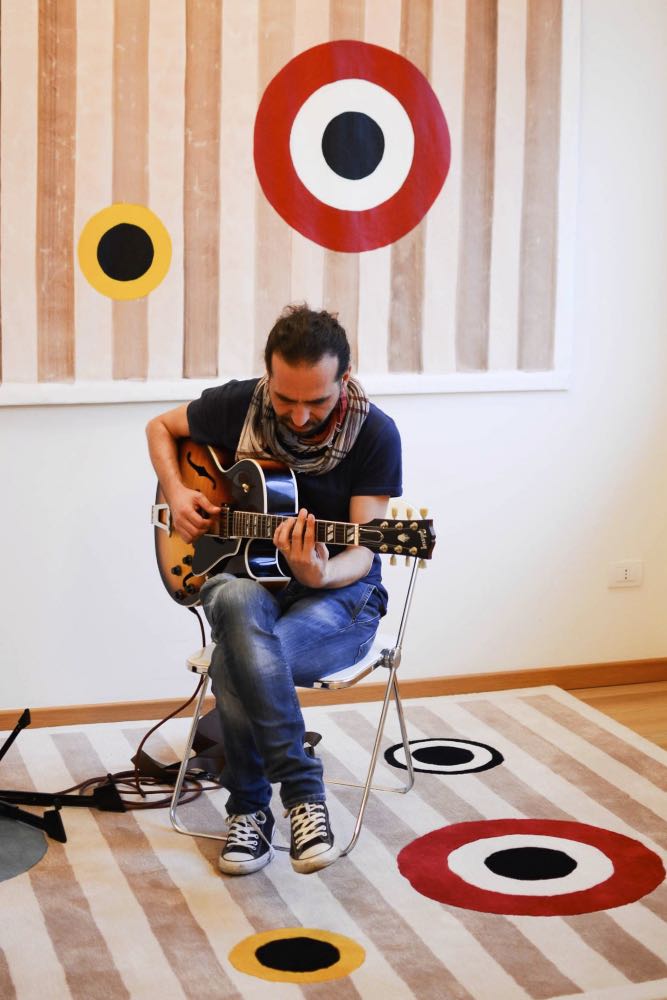 Gli Occhi Third Serie has been presented on Friday, May 15, at TerzopianoOS; guitar guest Fabrizio Scrivano. All painting are acrylic on canvas. Occhi nel canneto, 126x79 in.; Occhi nel cielo, 60x79 in.; Green shitting bird, Molte piume e Scende la notte 27x39 in. The rug from Gli occhi nel canneto has been woven in India in wool and viscose, 123x79 in.