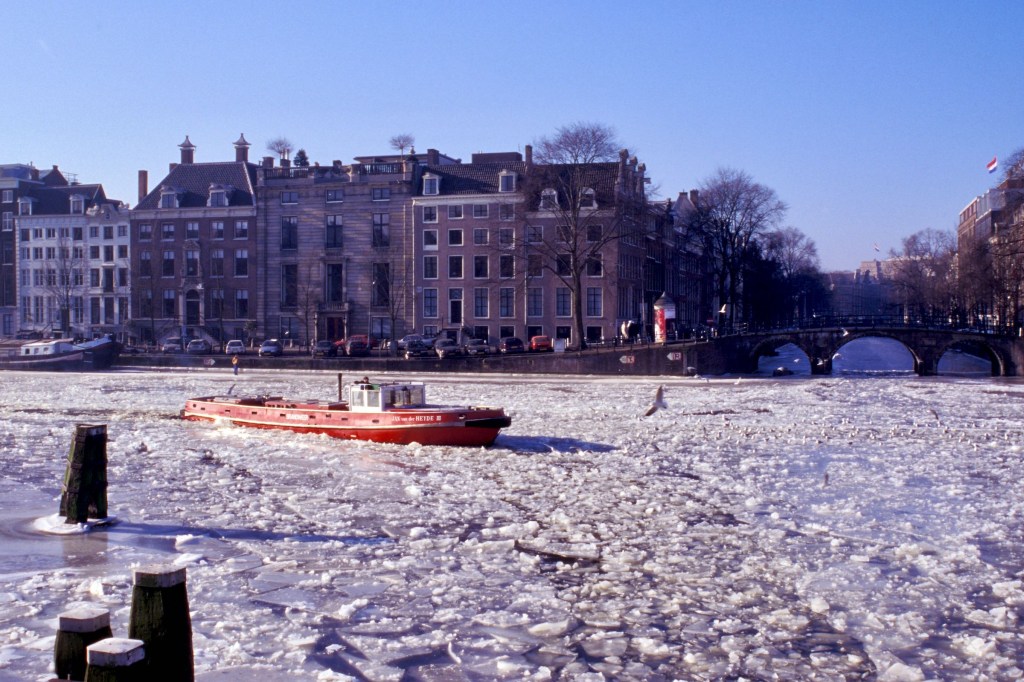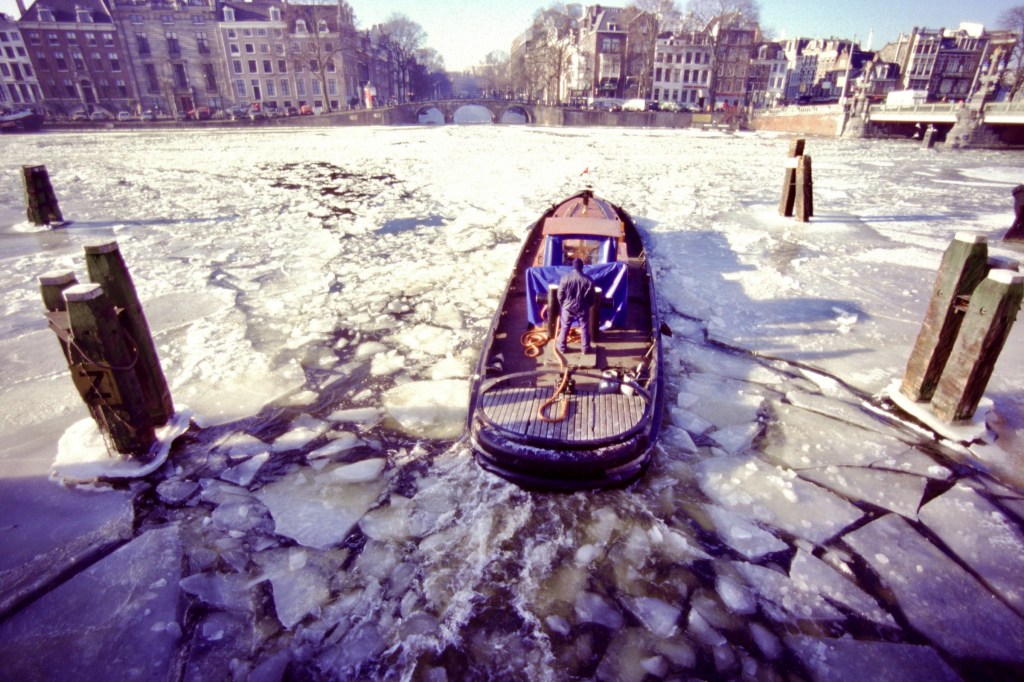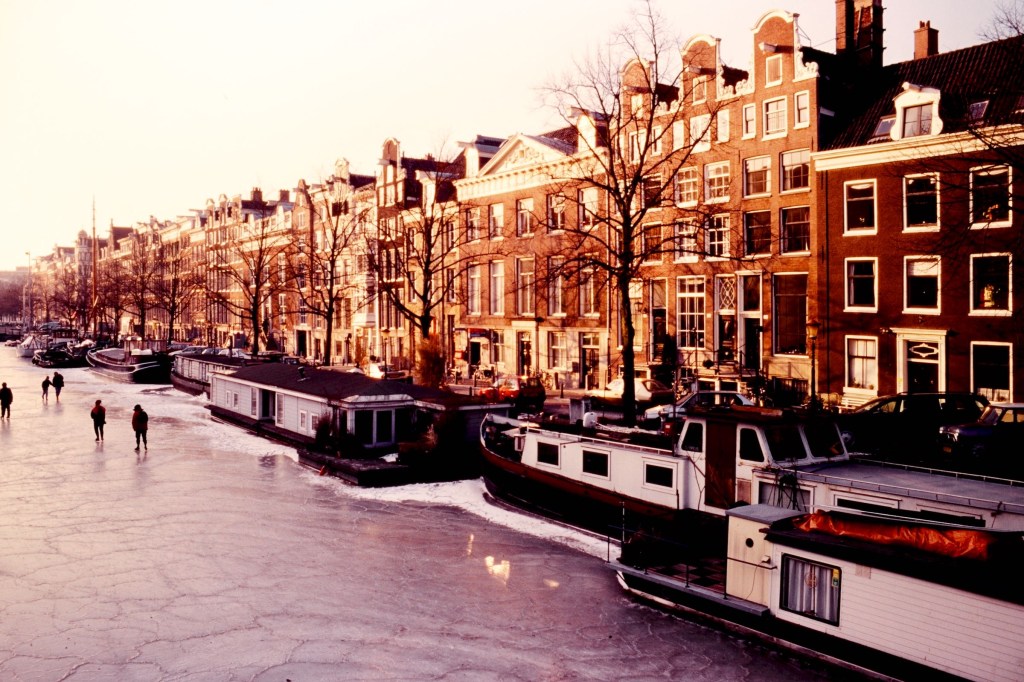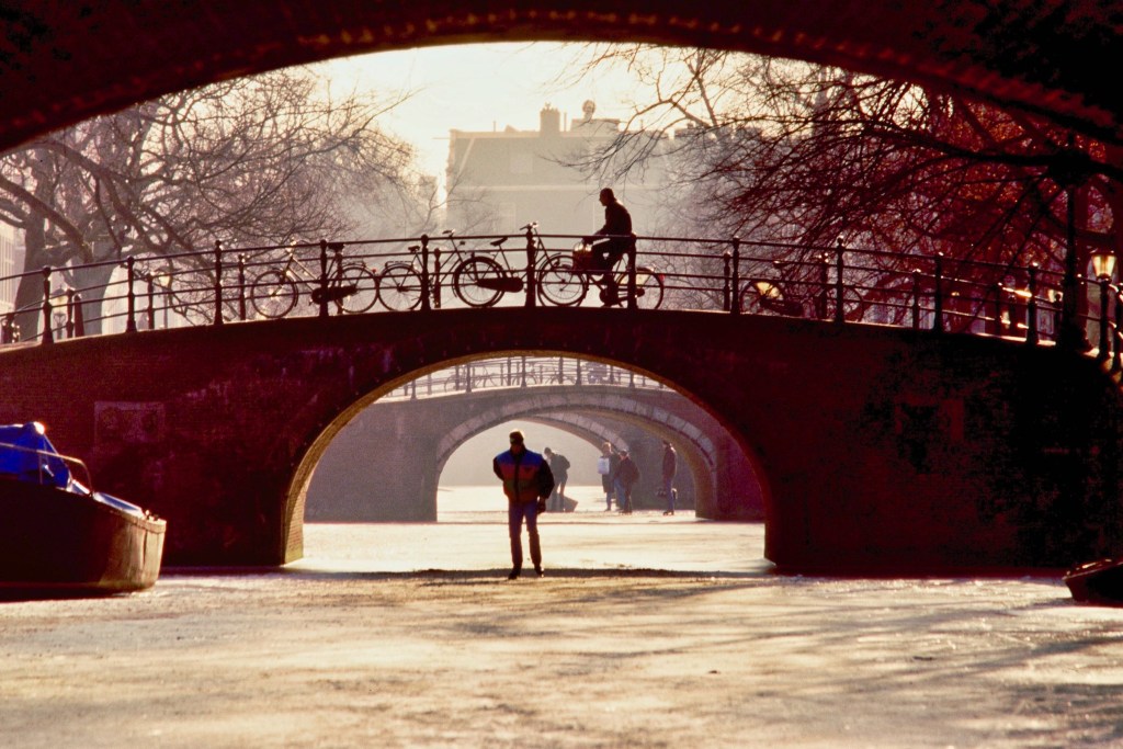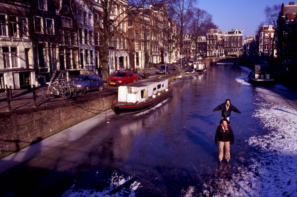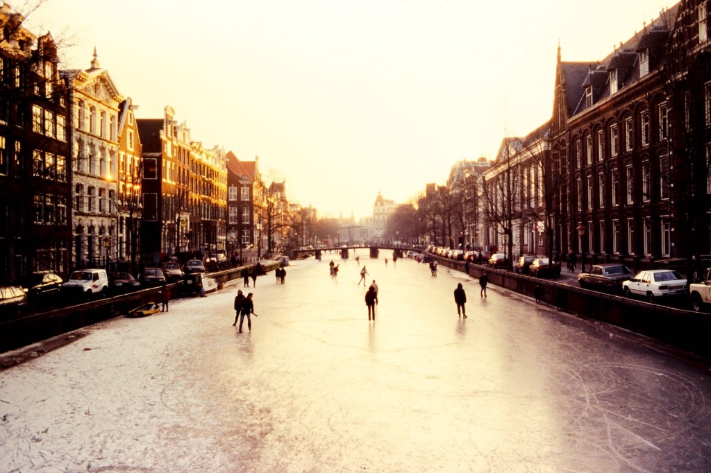 Among the many things that identify Dutch people, ice skating is probably one of the most peculiar. You cannot skate either on tropical sandy beaches or on gentle windswept grass covered hills. Did you visualize that? Ok. So, in order to be able to ice skate, beside balance and agility, one needs a flat ice-covered surface … what could that be … canals! Bingo! There’s plenty of canals in Amsterdam. Wait for a cold winter, though. And, just remember: stay away from the big wide ones where boats have recently passed.