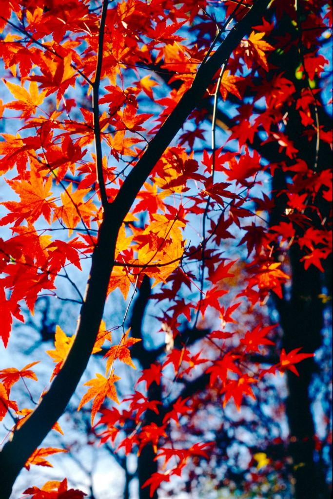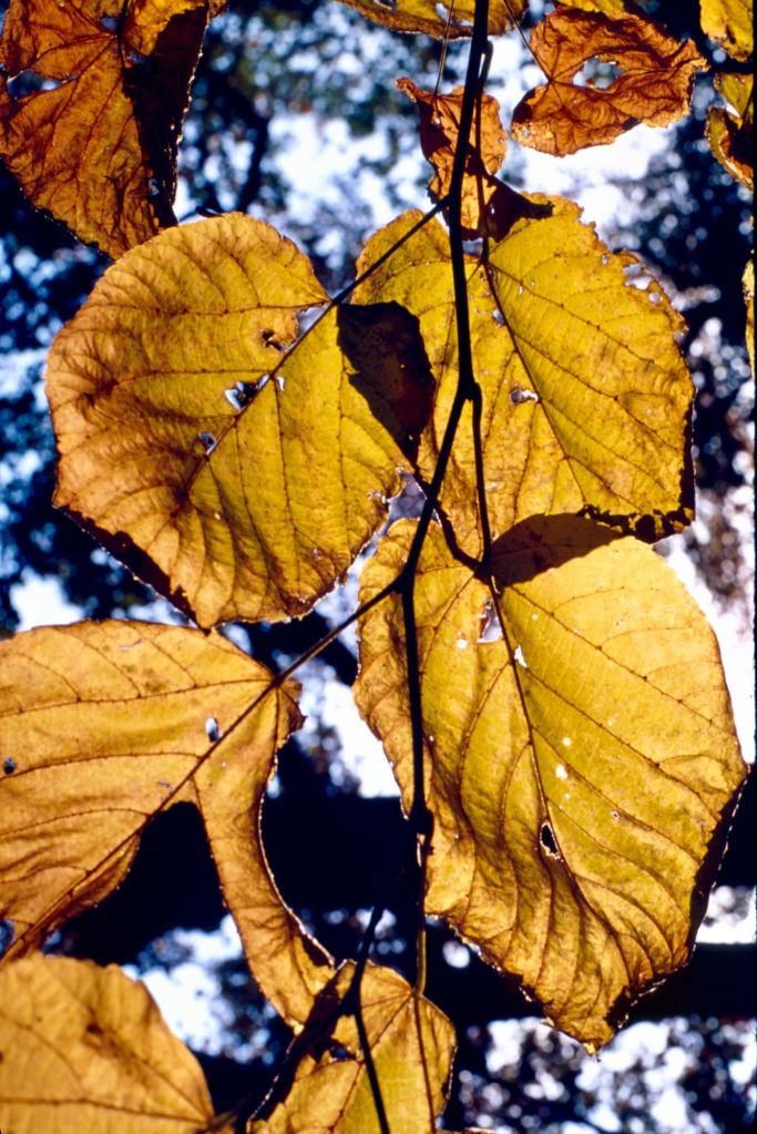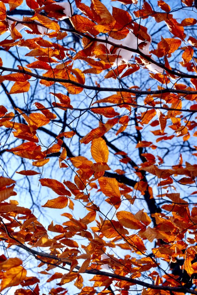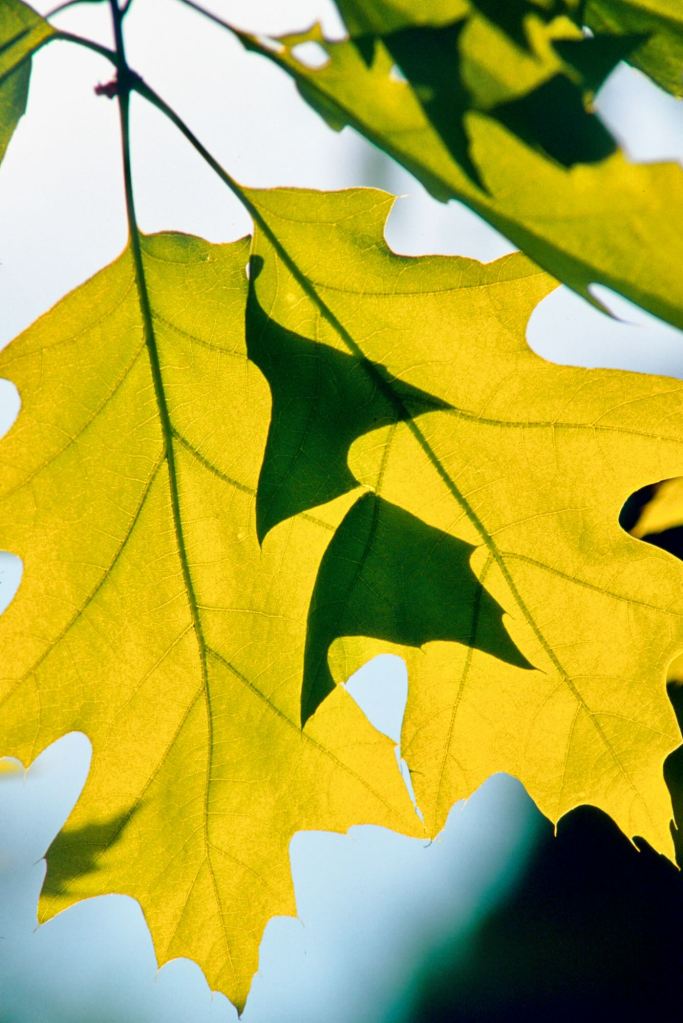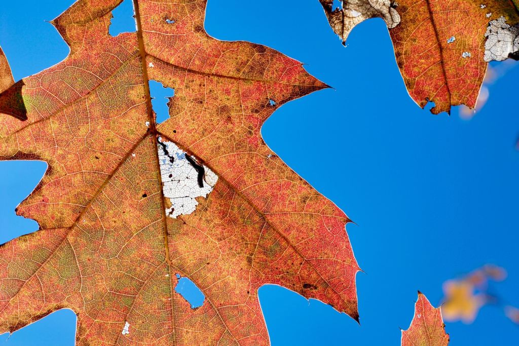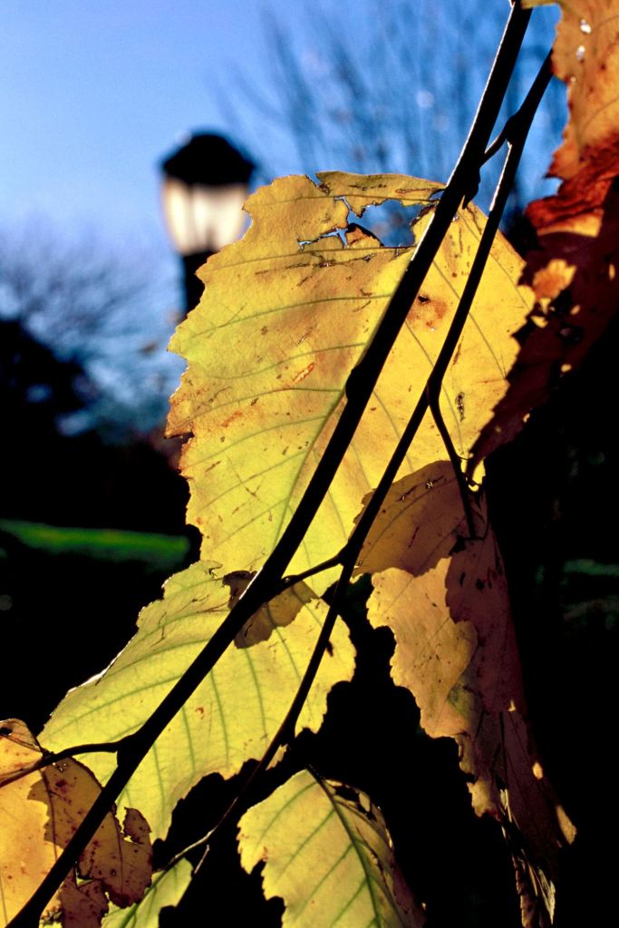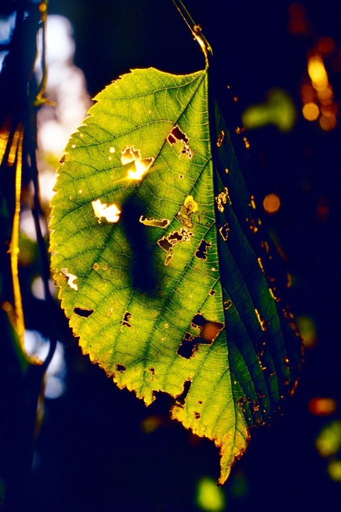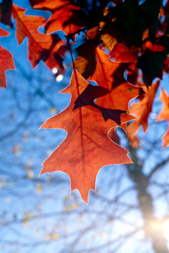 There is a small act of audacity in placing something between the sun and the eye. A leaf, a petal, a branch still holding on — suddenly the light that usually passes through everything is caught, suspended inside a membrane of pigment and tissue. What was invisible becomes legible: the veins running through amber and crimson, the places where green has already given way, the fine architecture that holds a living thing together. The leaf, backlit, stops being a surface and becomes a depth.