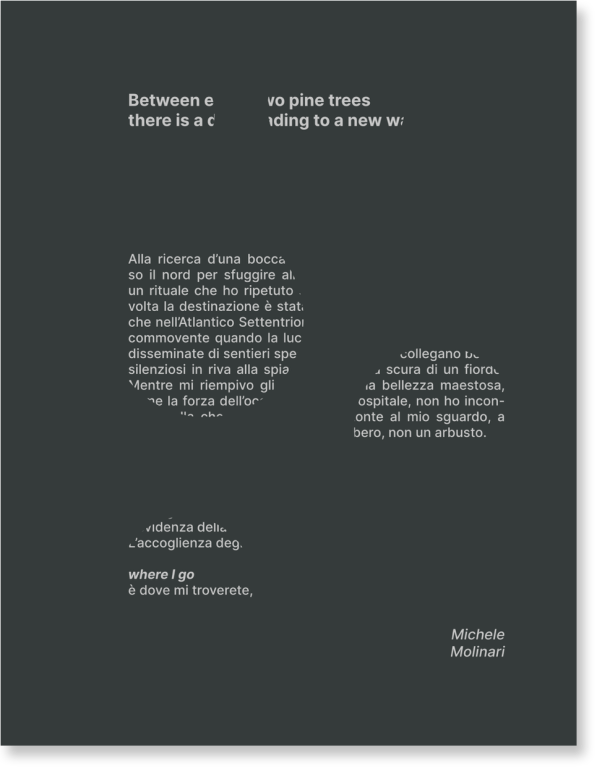 Formato: 17 x 22 cm: Rilegatura: Fastener; Copertina: Gmund Colors Matt 60 300gr. - con fustella in prima; Interno: primo e ultimo foglio Gmund Colors Matt 60 100gr. con stampa grigio digitale